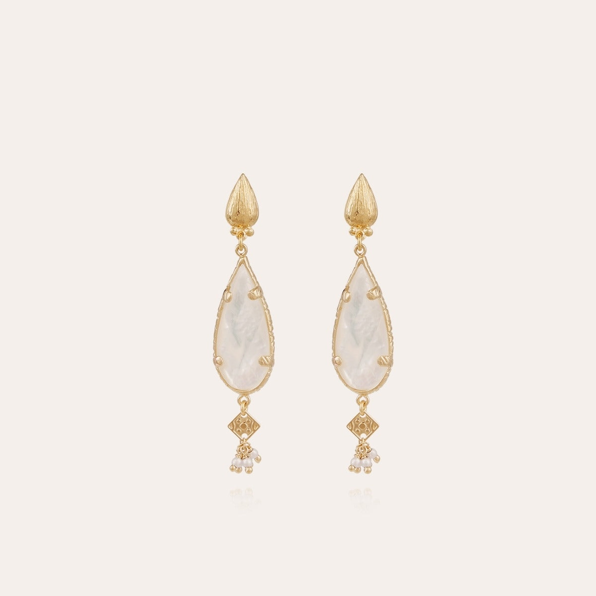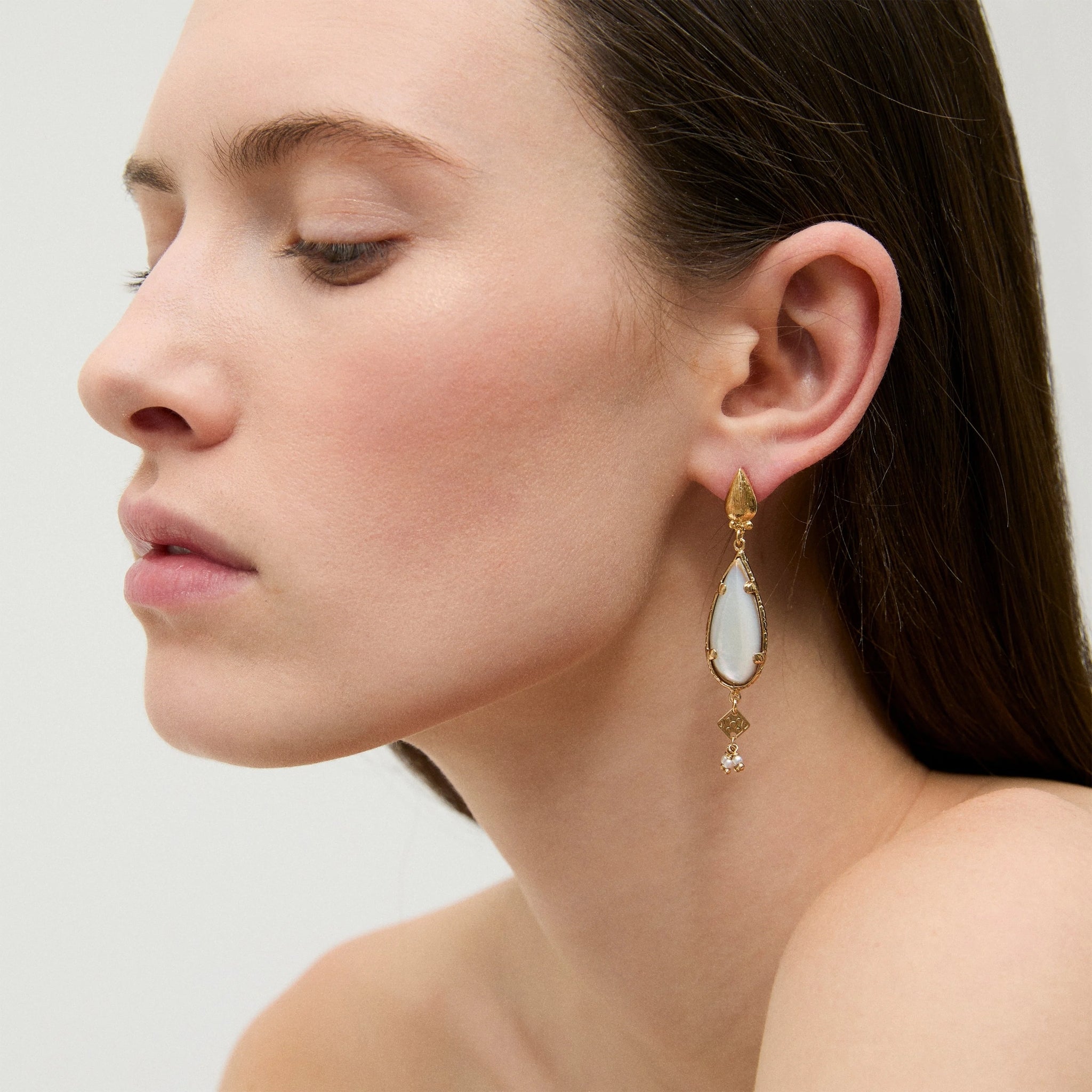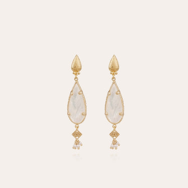 Pozlacené náušnice zdobené bílou perletí, organickým kamenem ve tvaru kapky.